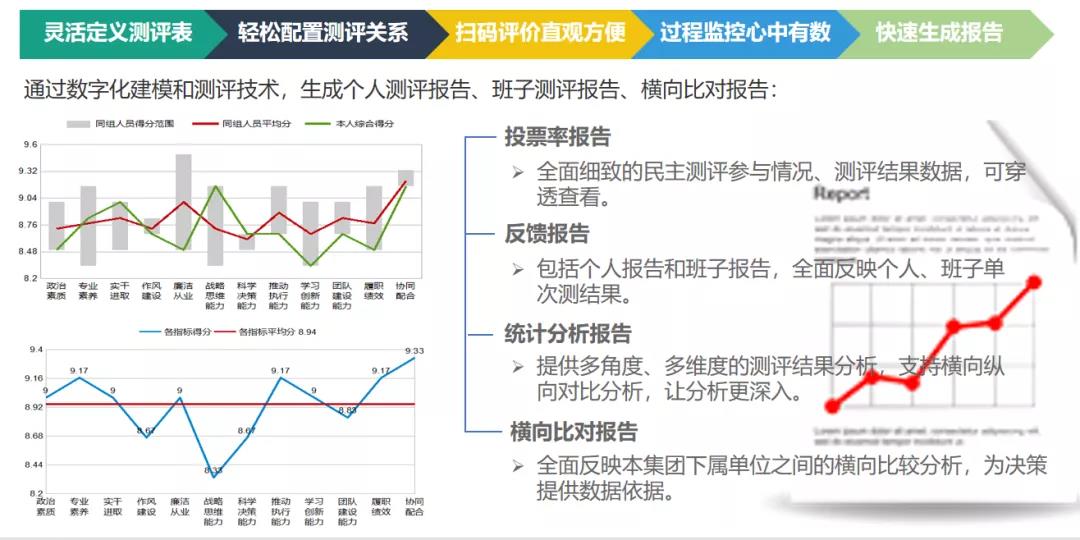 打分结束后,能够立即生成精确的数据统计分析报告、分门别类的意见整理、用于归档的原始票。同时,能针对每个被评价对象,即时生成图文并茂的评估反馈报告,针对性地为每位干部及员工指明工作改进方向,以更加科学的方式对干部进行盘点、考察和培养。