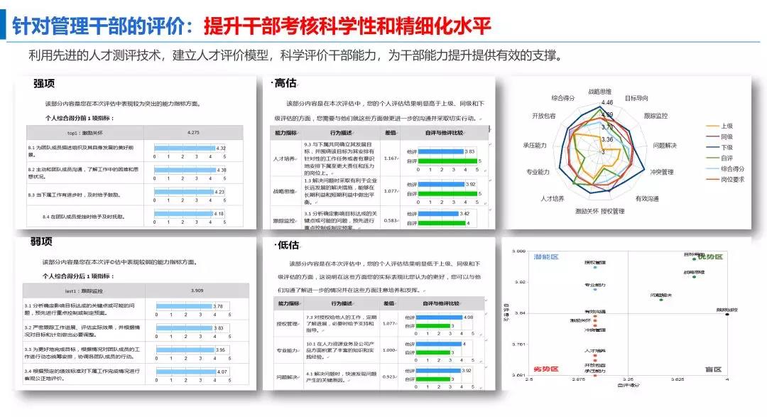 同时,我们为被评估对象生成专业的360度评估报告,帮助用户真正进入人才管理时代,促进被评估对象的自我认知,充分开发人才资源,支持选人、用人的科学决策。宏景云的人才评估师,还可以为用户提供专业的人才评估模型的咨询、360度评估报告的解读和诊断等专业人才管理服务。