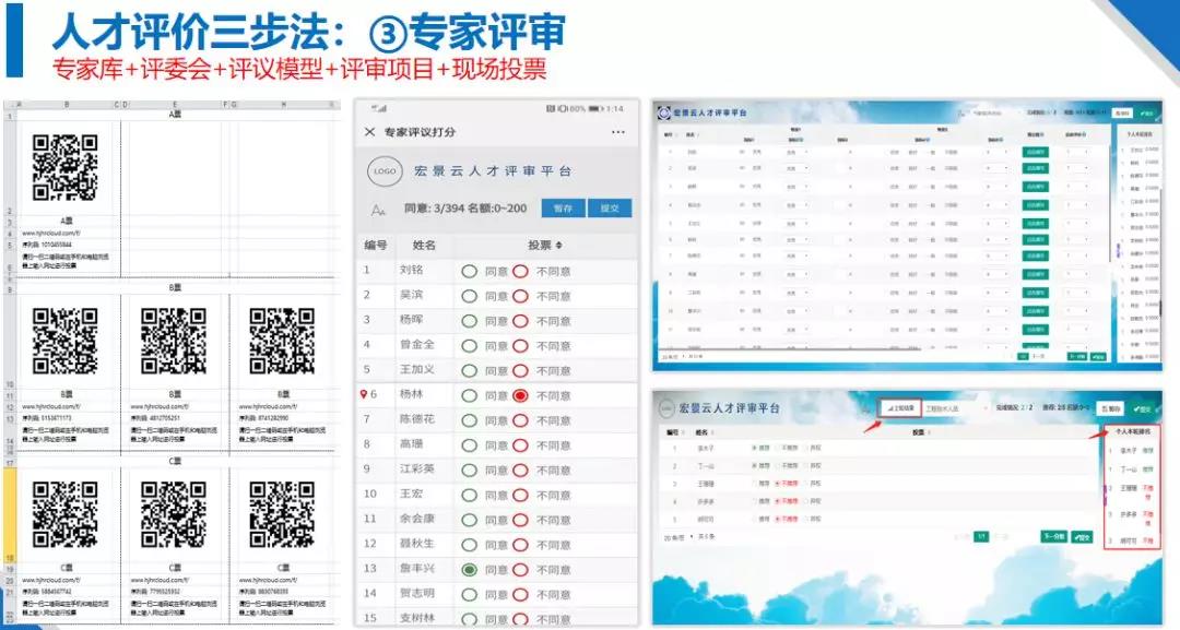 基于宏景云大型央企用户的干部民主测评真实需求和我们的咨询经验,宏景云民主测评模块形成了体系化的解决方案:测评表个性化配置,通过傻瓜式的操作轻松实现复杂统计要求,使得评估关系快速、智能生成;针对匿名性要求,宏景云独创了三重随机的机制,保证投票的匿名性,通过二维码扫一扫打分和电脑打分,实时监控打分情况,并一键下载统计分析报告和个人(班子)反馈评估报告,支持原始票下载备查。
