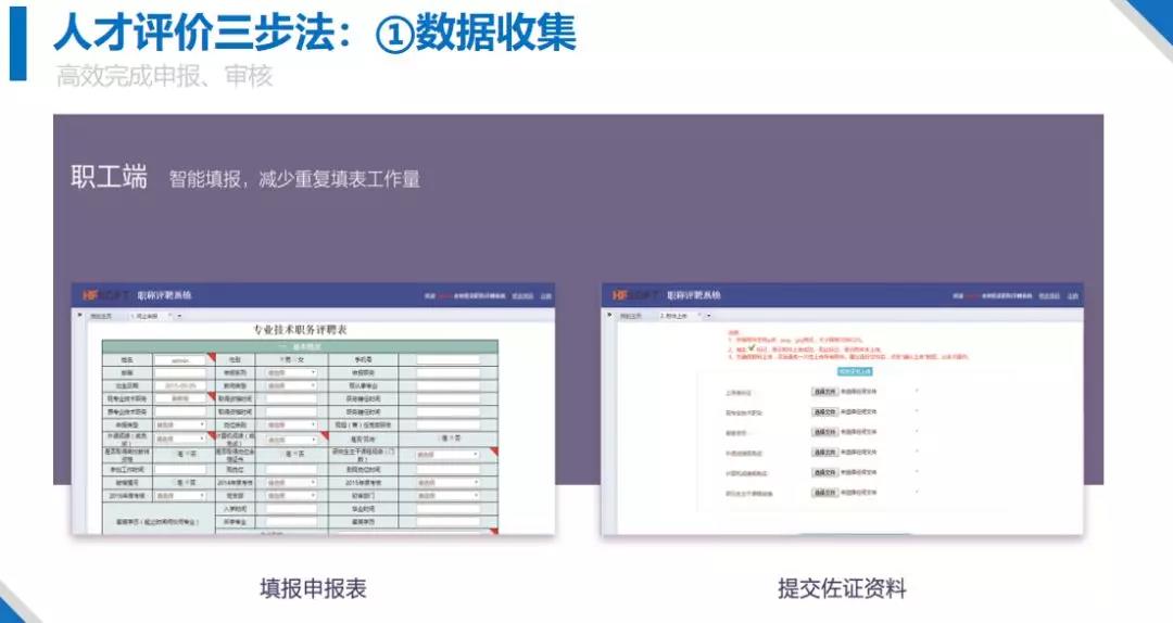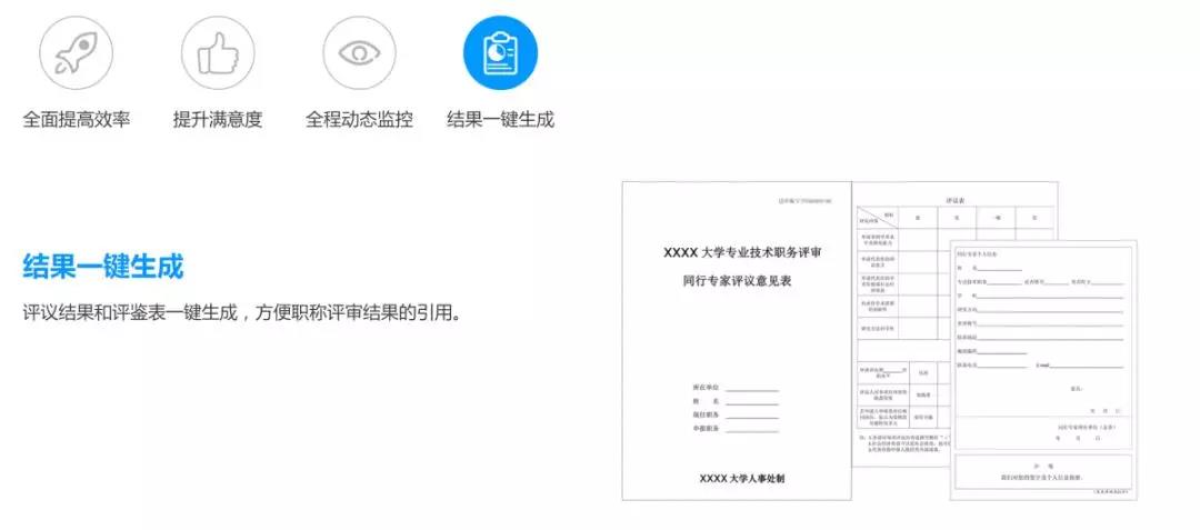 职称评审(针对专业技术人才的评价)是我国专业技术人才评价最重要的一个环节,在人才评价中国有着举足轻重的分量。特别是对于知识密集型单位,是其人才管理当中最为重要、权威的一个环节。职称评审一般由几个环节组成:(1)个人申报环节(2)同行评议环节(3)评审评议环节。由于人事部门受限于技术条件,无法提供高效的评价服务,导致职称评审工作效率低下、体验欠佳。比如,申报人重复填表的意见很大,同行评议的效率很低,投票计票的工作量很大。