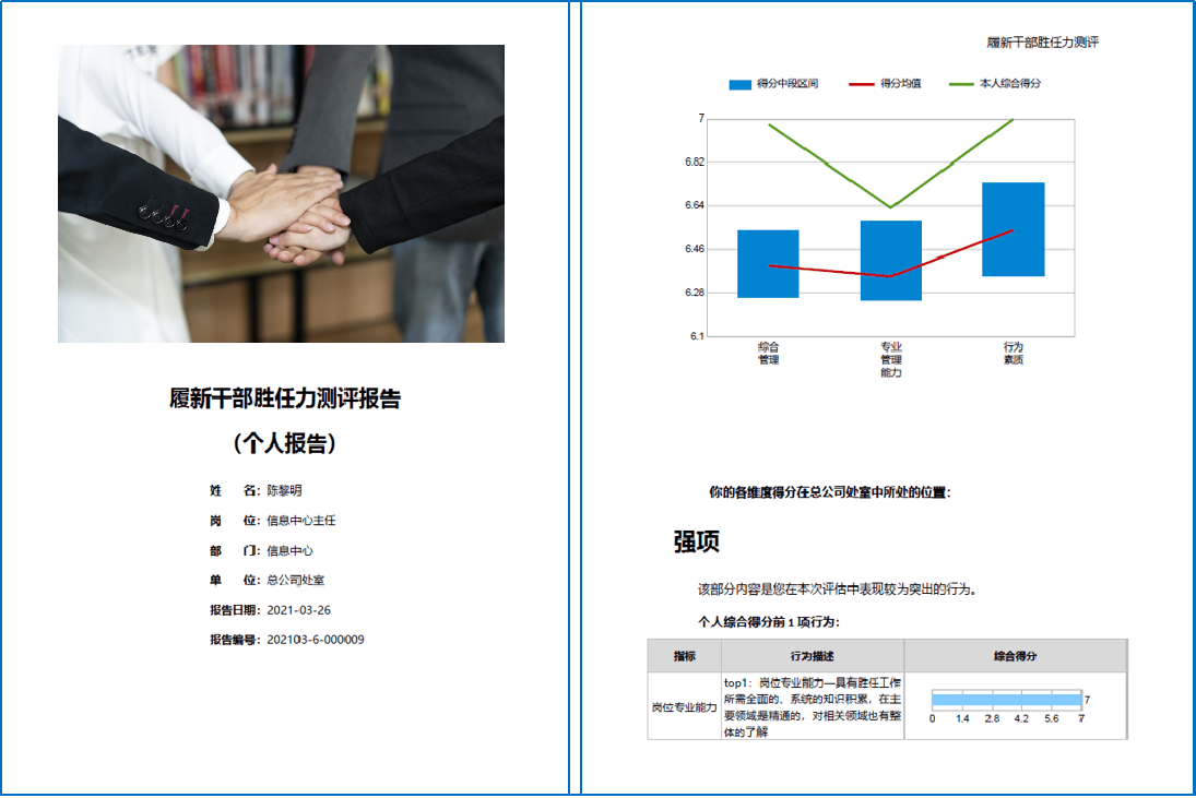 测评采用360度评估方法,通过领导评价、同级评价、下级评价、自我评价的多维度评价方法,从开始准备至测评结束,整体过程用时2天。测评完成后,平台智能为每位被测评干部生成测评报告,从强项、弱项、高估、低估、分歧、共识等多个方面,详细分析每项能力所处区域,形成能力地图。通过此次评估不仅帮助员工全面、真实、客观的了解自身情况,也为高潜人才识别、干部选拔任用、培训需求诊断、胜任力发展、辅助干部能力提升提供科学依据。