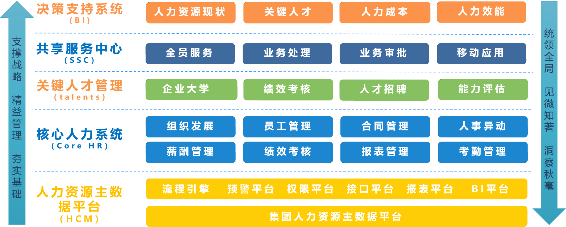 在人力资源管理信息化工作中,规划与体系建设方面十分关键。系统建设初期,科学合理的做好人力资源信息化建设的顶层设计和业务规划,制定人力资源数字化的三年实施规划,开展各阶段人力资源业务业务体系设计,引入人力资源数字化咨询,培养人力资源数字化人才队伍,分阶段、有步骤的开展各项工作,最终实现集团人力资源数字化转型的整体战略目标。