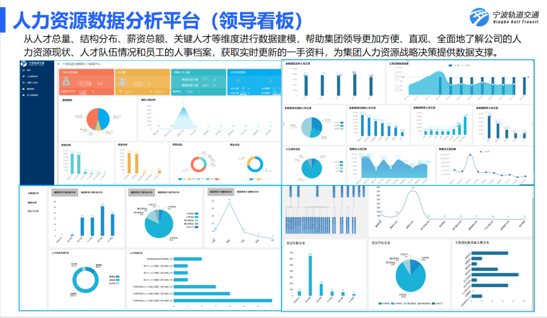项目小组采用第三方BI平台、以决策视野对人力资源平台的数据进行了抽象和建模,开发了人才总量、人才结构、薪酬总额、中层干部、关键人才的数据分析大屏,有效提升了集团领导的感知度和满意度。