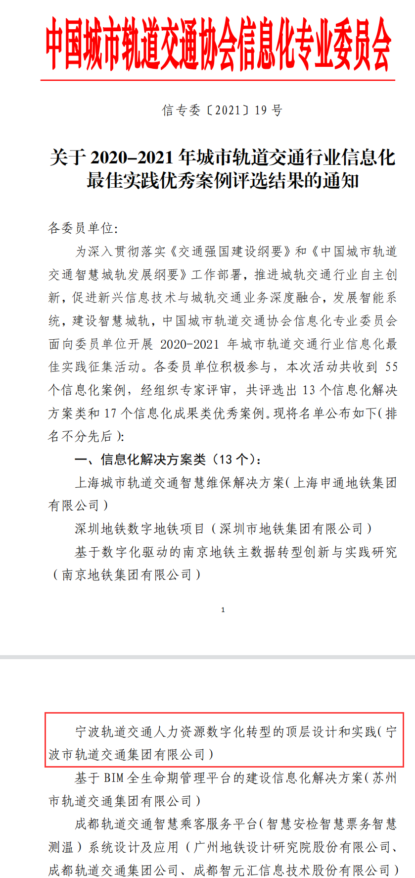 近日,由我司提供人力资源咨询和整体数字化建设的宁波轨道交通集团人力资源数字化转型项目荣获《中国城市轨道交通协会2020-2021信息化最佳实践优秀案例》奖,是我司又一个全国性的数字人力建设项目奖项。