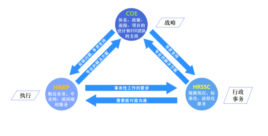 比如COE和HRBP的协同。COE在制定人力资源政策时应和HRBP充分沟通,让他们理解政策背后的战略意义,并且积极听取HRBP的建议和反馈,充分考虑不同业务的不同管理情景和业务诉求。当然,HRBP在充分理解这些政策的战略意义和底层逻辑的基础上,有义务积极反馈业务需求,并在政策确定后,负责将其在业务部门落地执行;同样的,HRBP在需要提供专业的人力资源解决方案用于支持业务部门时,可以寻求COE的支持和指导。