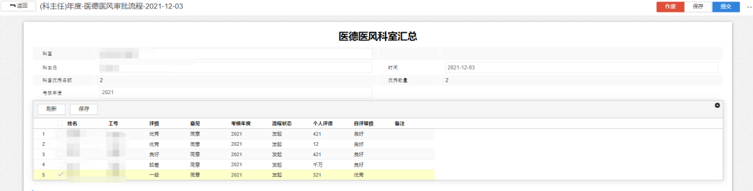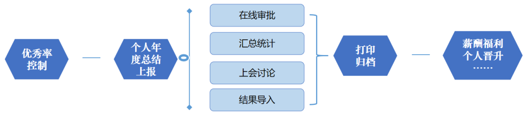 通过本次数字化建设,职工在线填报个人年度总结,各科室负责人在线批量给出科室评级并统一上报到年度考核职能账号,经院委会讨论最终结果后进行批量导入再进行打印归入各职工个人档案。不仅实现了规范管理,同时统计也十分方便灵活。