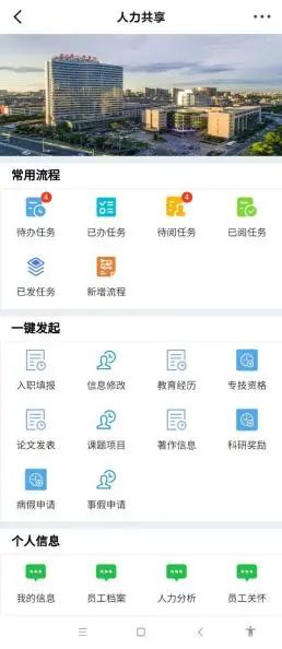 系统通过打造PC端、移动端均可登录的人力资源一站式快捷服务--共享服务中心,将待办、已办、待阅、消息通知等进行集成,将入职填报、信息修改、著作信息、事假病假修改等均可实现线上审批修改,方便快捷,大幅度提升员工的体验。