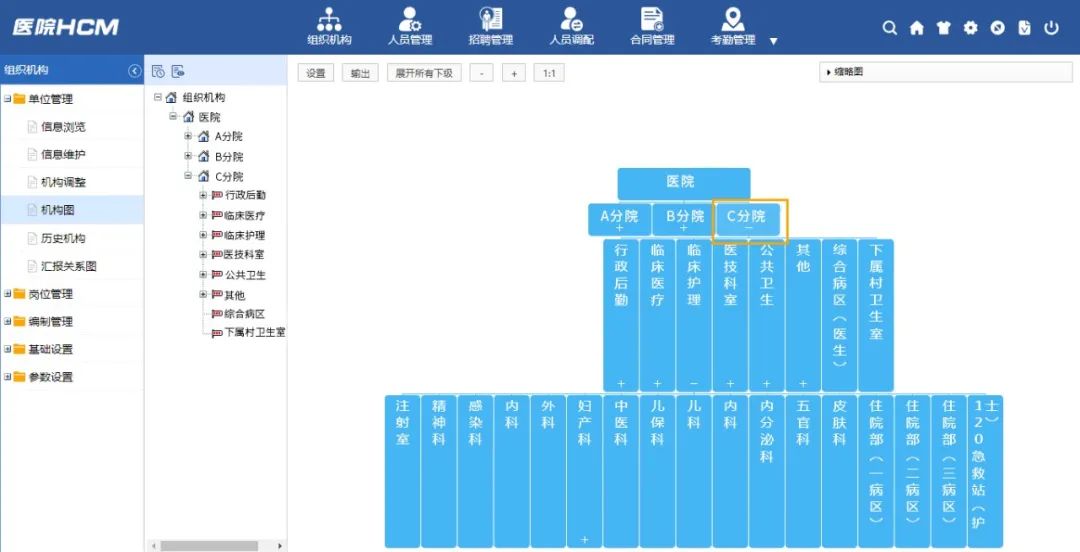 组织机构是各项政策、业务等实行的根基,随着医院的快速发展,集团化是医院发展的方向之一,这要求组织机构建设与业务的实际需要相匹配。本次人力资源管理系统建设以实际行政组织架构为基准,进一步梳理了医院的组织机构层级,医院组织架构清晰明了,院领导可以总揽全局,快速了解分散在不同园区的各个临床专业人员情况;总院各科室负责人可以对本科室人员了然于胸;各分院则可以掌握本院区的人员情况。为各项政策业务等变动提供清晰的管理思路。
