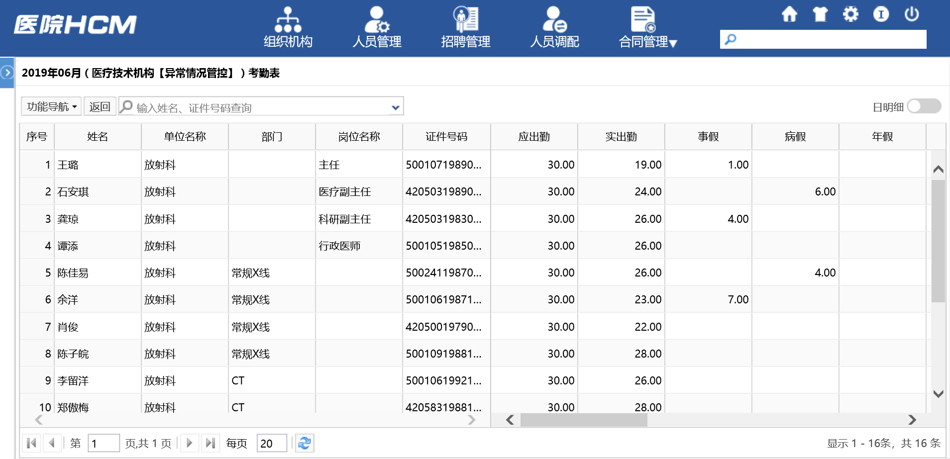 浙大二院通过考勤线上管理,共设置了共19类考勤项目及规则,科室考勤员仅需每月底填报请假等考勤信息便可上报审核,人力资源部可以直接在系统中批量审核各科室上报的考勤数据,审核无误后提交入库,三步即可完成月度考勤管理,在数据留痕的同时又能够参与工资核算,大大降低了职能科室与业务科室的考勤负担。