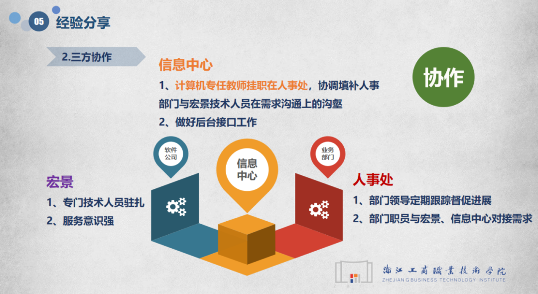 (2)对人事部门而言,相关领导在建设过程中会定期跟踪督促进展,充分沟通需求,并协调软件公司和信息中心做好对接。