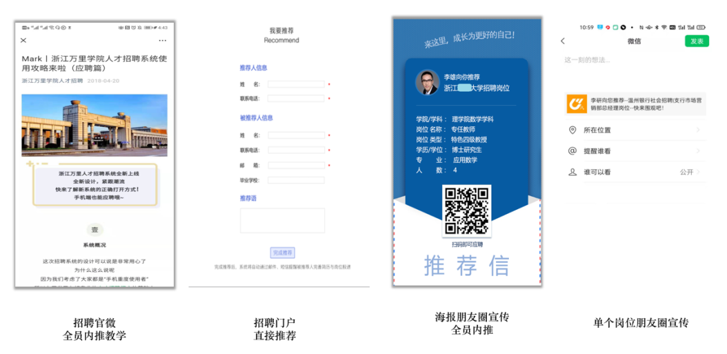 伴随人才引进社交属性的增强,基于人脉裂变提升人才吸引力,如员工内部推荐和全员猎聘的应用愈加普遍。君顾招聘为高职院校提供多种内推方式,支持全员参与招聘。