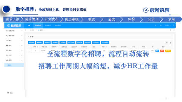 以数字化技术变革招聘管理,全面赋能组织人才招聘。通过君顾招聘平台,教育系统以高效能招聘为目标,实现从需求上报到录用审核的招聘全流程数字化管理,高效辅助招聘决策。