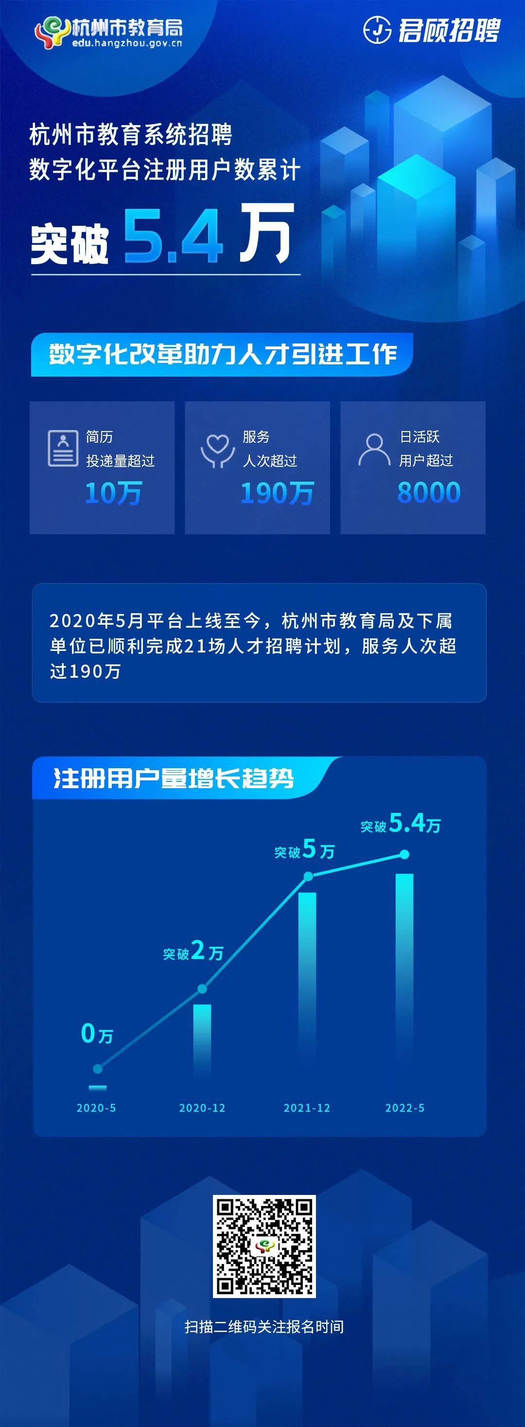 自2020年5月招聘平台上线至今,杭州市教育局及所属单位已顺利完成21场人才招聘计划,注册用户数累计突破5.5万,简历投递量超过5万,服务人次超过190万,日活跃用户超过8000。