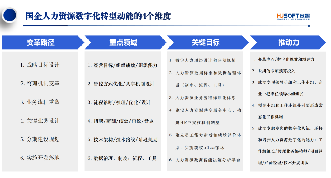 推动国有企业进行人力资源数字化转型,离不开对变革路径、重点领域、关键目标以及推动力4个维度的考虑,变革路径通常包含战略目标设计、管理机制变革、业务流程重塑、关键业务设计、分期建设规划、实施开发落地,然而,基于国有企业的实际情况以及转型目标要求的不同,重点领域及关键目标的细分内涵也不尽相同,比如集团型企业或拥有多业态子(分)公司的企业,重点领域涉及管控方式的探讨和优化,以及共享机制的设计;企业建设人力资源系统多年,数据仍然不准确、无法辅助领导决策,关键目标就会涉及制度、流程到工具的数据治理。