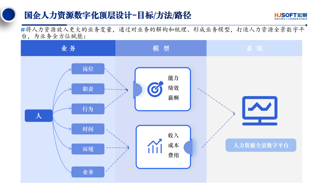 在进行顶层设计时,将人力资源放到更大的业务变量中考量,基于人的岗位、职责、绩效目标等对业务进行解构和梳理,形成有关能力、绩效、薪酬、人力资本等成熟业务模型,匹配到不同的业务场景中,打造人力资源全景数字平台,将人力资源融入企业的数字生态,实现人、财、物一体化,综合考虑和主数据、财务共享、资产管理、业务管理的系统数据要求。