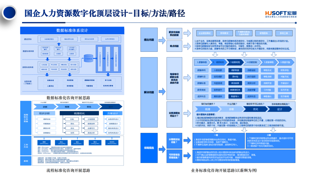 在数据标准化、流程标准化、业务标准化等关键领域人力资源数字化落地时,要用管理咨询的方法来做业务设计,以业务诊断和咨询引领技术。