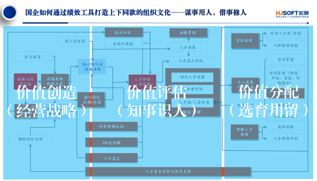 实际上,人事工作并不是孤立的,人力资源管理是“谋事用人”,绩效管理是“借事修人”,通过人和事的匹配,最终达到人事相宜、人尽其才的目标。基于国有企业的战略经营目标做好目标设计、目标分解,就是价值创造环节;基于组织目标构建涵盖业绩、能力、人员、非人员等标签的核心岗位高绩效画像,建立组织能力与员工能力画像,过程中会涉及价值评价,在绩效评价过程中抽取关键的维度反哺到人才画像中,可以快速评价干部到底能不能“干事”、能不能“成事”;绩效结果应用即价值分配环节不仅仅体现在薪酬上,更应用于员工的选育用留各个环节,能力不足的人要制定发展计划、进行绩效辅导,不匹配的人员则需要及时淘汰。