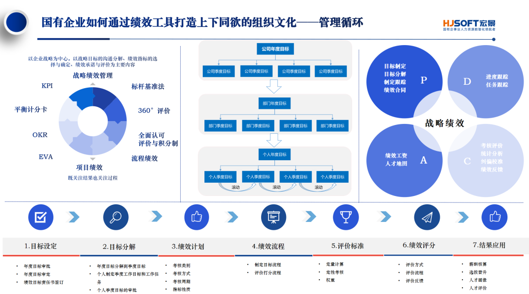 因此,绩效管理是人事管理的主线、纲领,只有将绩效管理和人事管理串联起来,综合考虑企业战略、文化、组织能力,才能形成管理循环;通过KPI、OKR、360°评价等绩效管理方法,将公司年度目标层层分解到部门与个人,达成从目标设定、目标分解、绩效计划、绩效流程、评价标准、绩效评分到结果应用的有效管理闭环,参照以上所述,关于绩效程序的建立便是有迹可循的,可以在不同环节做好相应的绩效工作和安排,实现自上而下的绩效传导和自下而上的绩效承接。