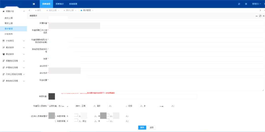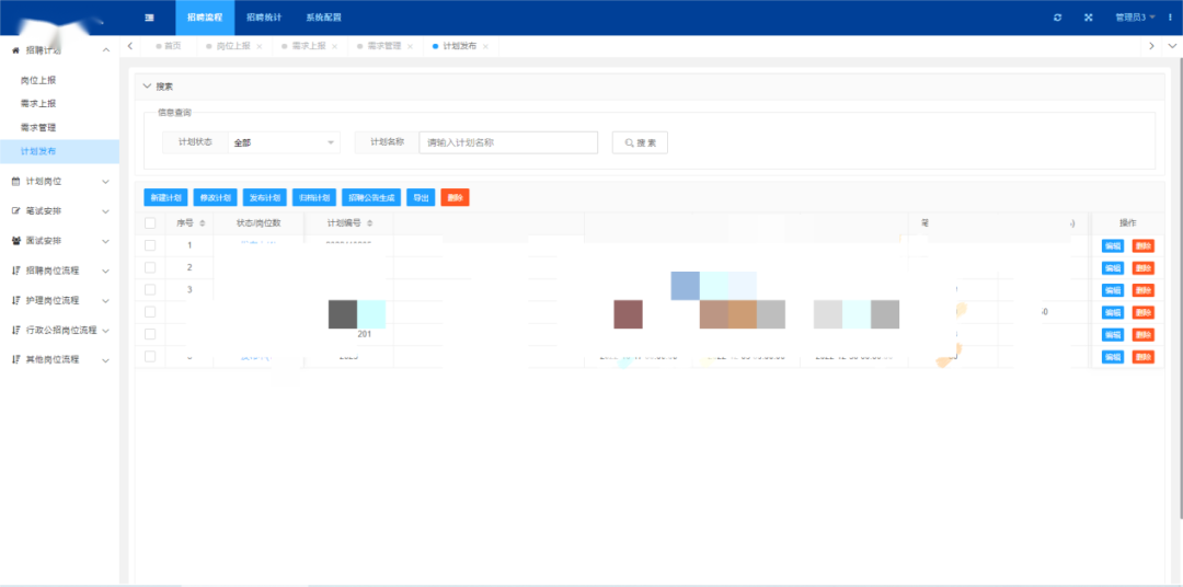 医院各个科室可通过招聘平台提交科室用人需求,进行需求上报,由总院人力资源部在招聘平台进行审批和修改,审批同意后需求计划自动流转到下一个环节,如果审批不同意则驳回到原科室。人力资源部可将审批同意的需求计划进行信息编辑,快速发布招聘计划,提升用人部门和科室、人事工作者双方的工作效率。