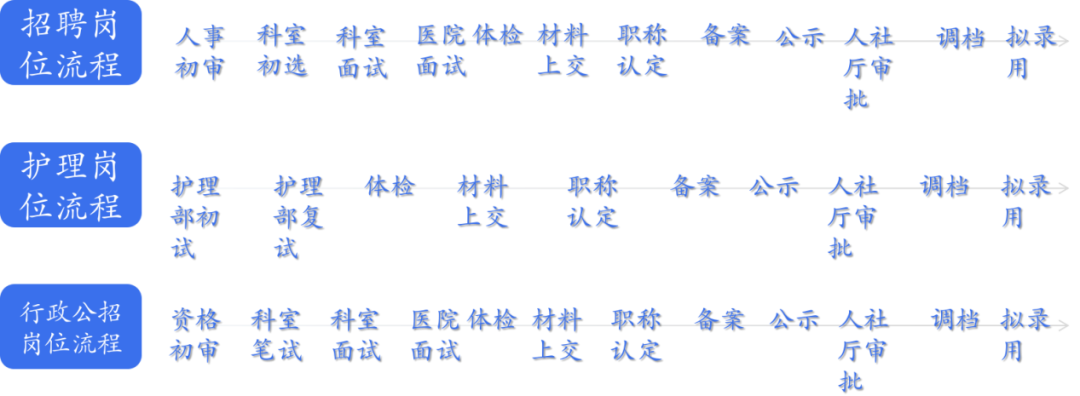不同的岗位通常具有不同的招聘流程和简历要求,系统支持管理员在后台根据需求和计划设置相关要求,灵活定义招聘岗位分类(护理岗位流程、招聘岗位流程、行政公招岗位流程、其他岗位流程等等),在此基础上设置不同的招聘程序和流程,并灵活定义不同的简历模板,以满足招聘岗位的需求,详细展示用人单位需要的应聘者信息和人才评价指标,帮助用人单位科学评价应聘者,实现精准的匹配方式。当应聘者投递简历后,简历自动按照岗位流程进行流转,部分特殊人员支持进行流程调剂,以满足医院对人才的个性化管理方式和程序的合规性。