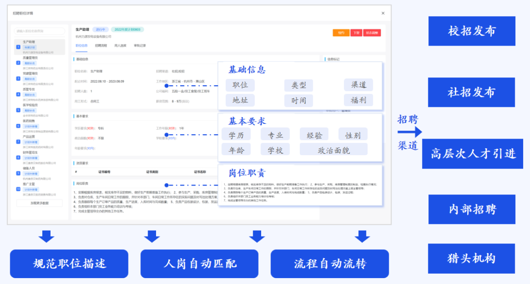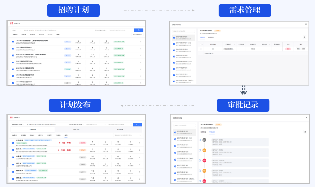 根据企业招聘管理方案,系统支持按照实际招聘流程和规范灵活设计企业招聘需求管理模块,建立招聘业务统一运行平台,实现跨部门、多角色的协同功能;同时支持对招聘需求计划进行制定、上报、修改和审批,留下审批记录,落实管控要求;当需求通过后,可一键式对计划和岗位进行发布。