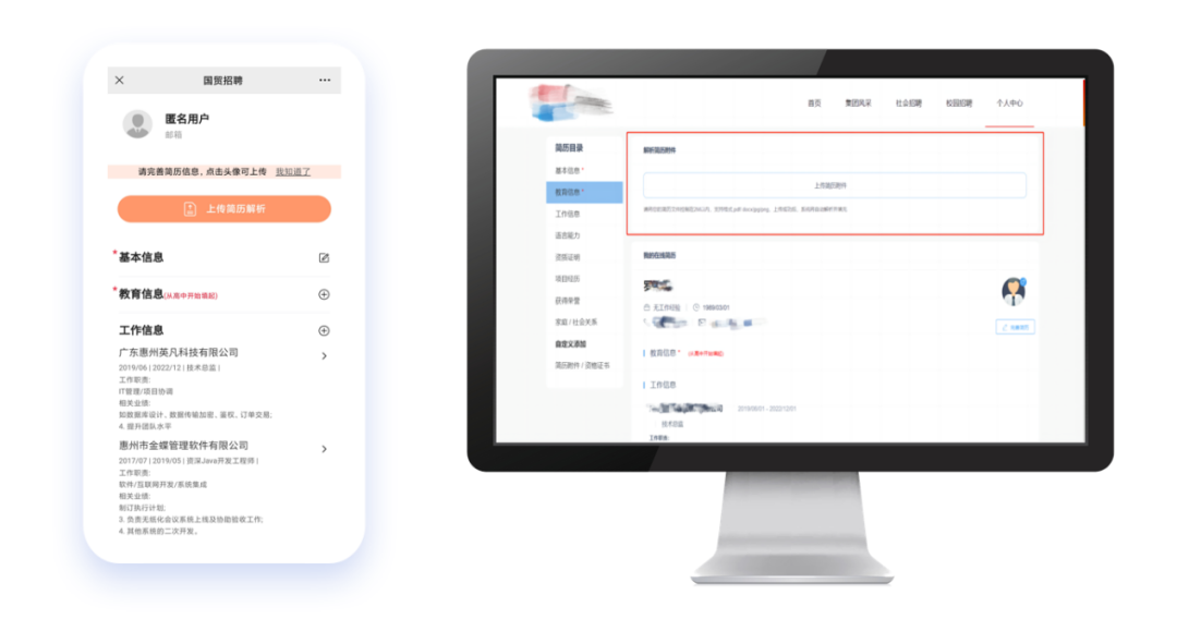 应聘者在求职期间往往会面临较多的雇主选择和大量的简历信息填写,本着“以人为本”的服务理念,君顾招聘系统支持附件简历上传和解析功能,大幅度减轻用户负担,平台依据企业设定的简历信息模板将应聘者相关信息自动填写至简历档案中,保证应聘者的信息完整度,同时为之后的人才评价工作留下依据和辅助决策,同时也为企业留下好评度。