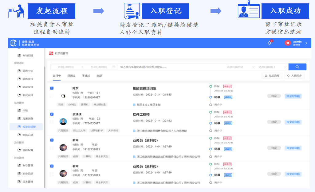 应聘选拔流程结束后,管理员可根据选拔结果在招聘平台中发起拟录用审批,按人员类别自动流转到相关负责人审批。通过数字化招聘平台可实现应聘者从拟录用状态、快速审批、信息采集、信息校验、在线合同签订到入职成功的快速响应,高效的线上流程真正打通员工入职的“最后一公里”,实现从应聘者到员工的快速切换。