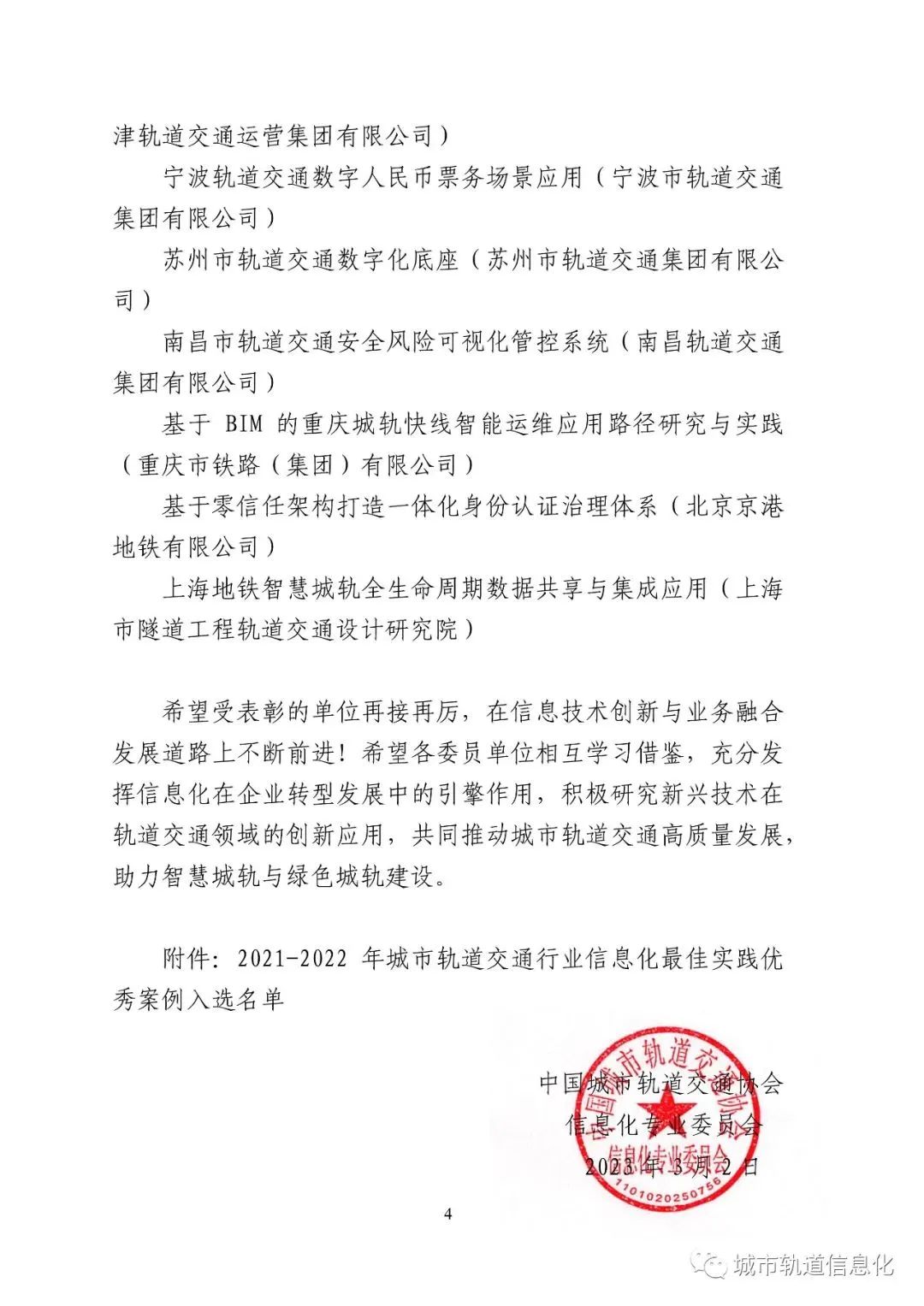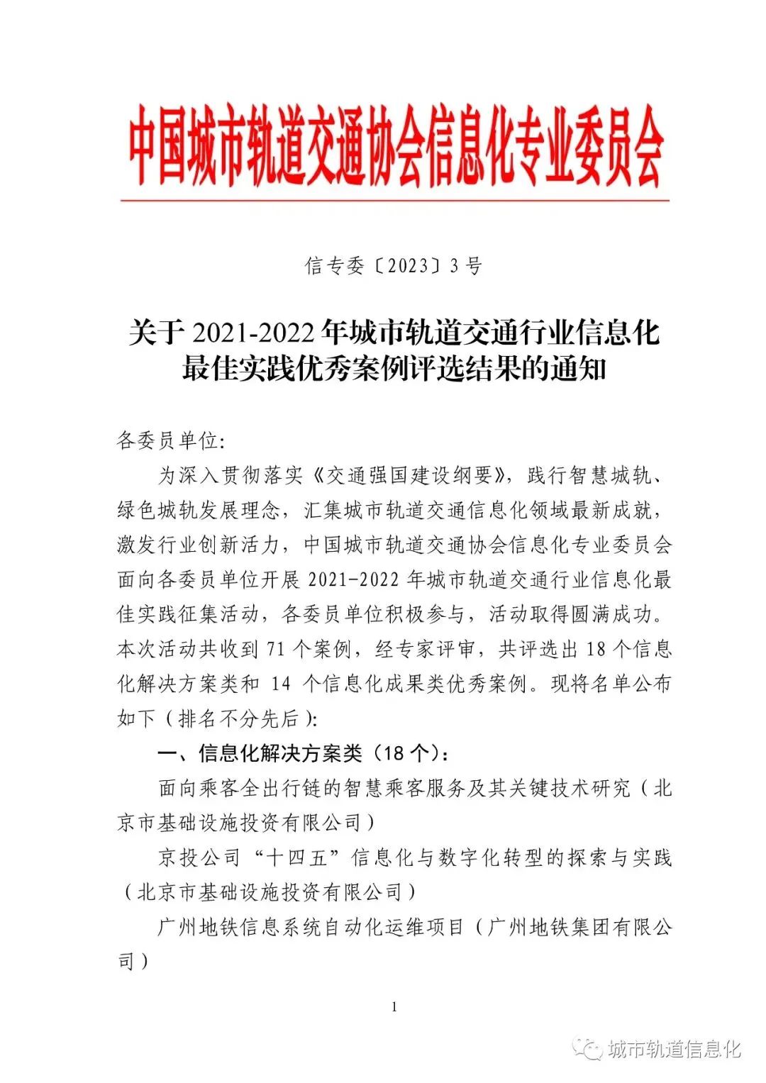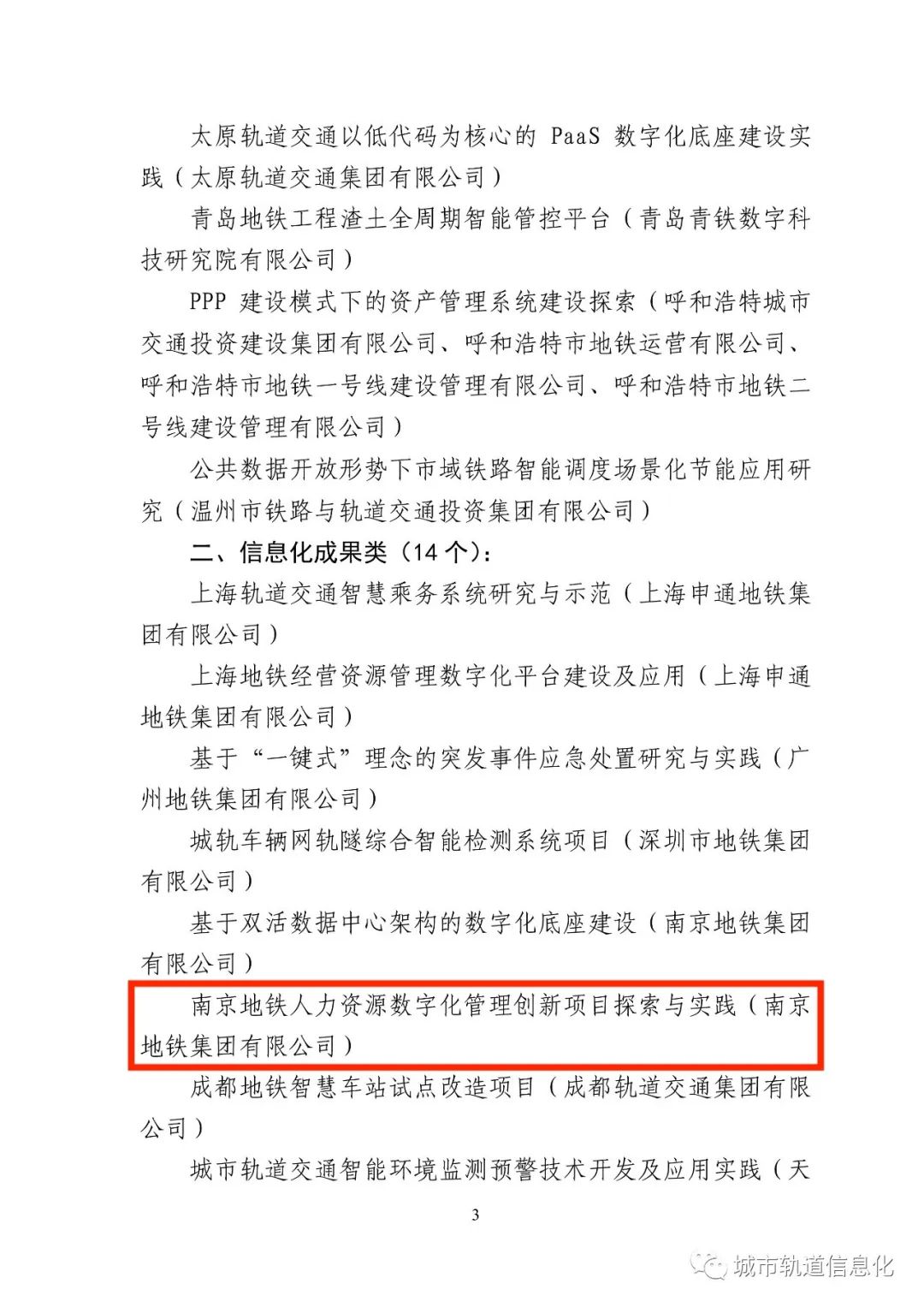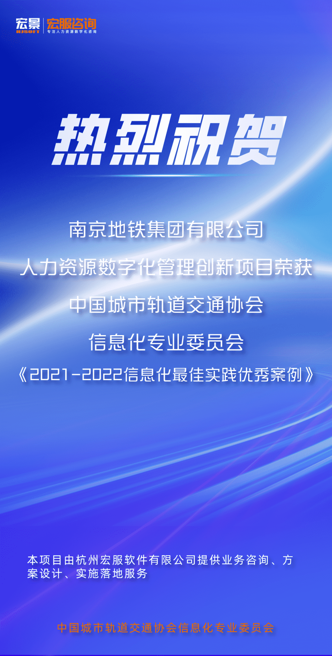 由我司提供人力资源数字化转型业务咨询、方案设计和实施落地的南京地铁集团有限公司人力资源数字化管理创新项目,近日荣获中国城市轨道交通协会信息化专业委员会《2021-2022年度城市轨道交通行业信息化最佳实践优秀案例》,这是我司继宁波轨道项目后在中国城市轨道交通协会获得的又一最佳实践优秀案例。