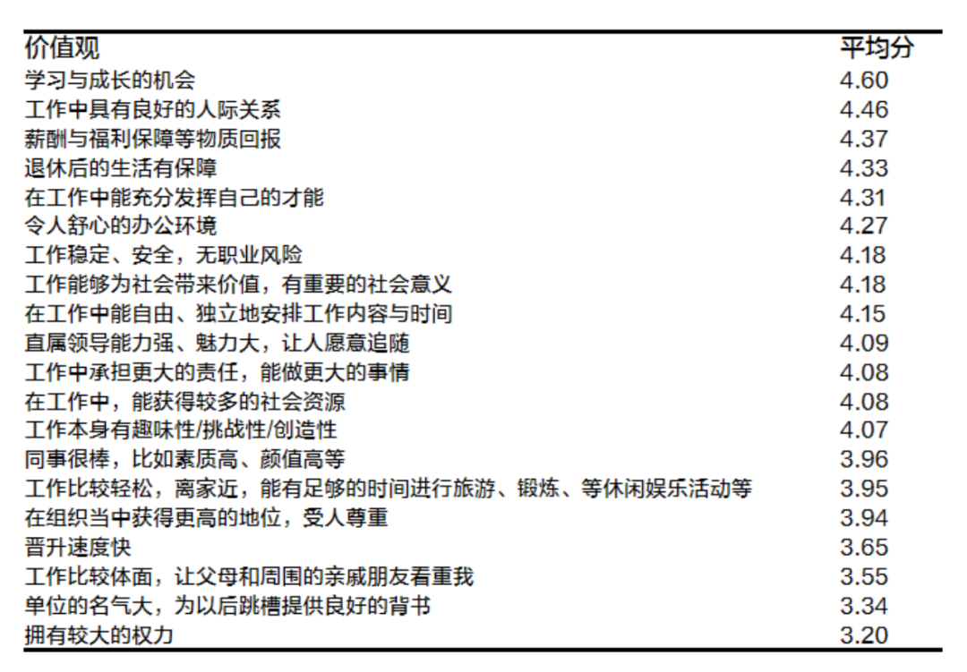 【工作价值观】据市场调研及相关学者研究显示,成长在物质水平极大丰富、经济条件愈加富足中的Z世代人群的价值观念已然发生了变化。经济利益并不是他们对工作追求的唯一衡量指标,学习与成长的机会、工作中具有良好的人际关系、在工作中能充分发挥自己的才能等富有强烈主观意愿的工作价值观愈加为Z世代人才所看重。