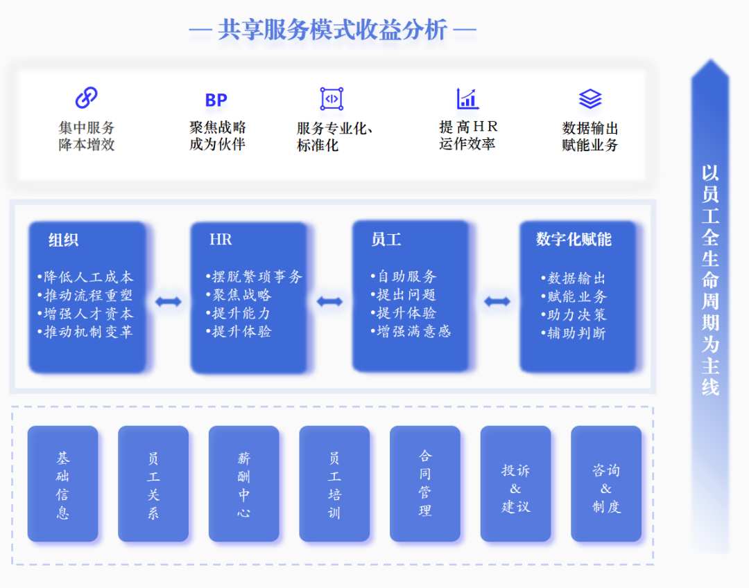 【人力共享机制设计】对共享服务与员工体验的场景化塑造关联着对企业人力共享服务机制的具体设计。而通过对组织、HR、员工的三大维度的分析与探索,从而实现员工全生命周期的数字化赋能。