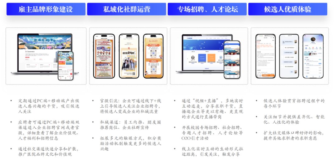 【人才吸引】结合数字工具和社交媒体传播雇主品牌,从单一媒体到全网覆盖,公域私域整合花式引流,建立双向沟通机制,重点打造候选人优质体验,从而提升候选人吸引比例,为人才工作持续赋能。