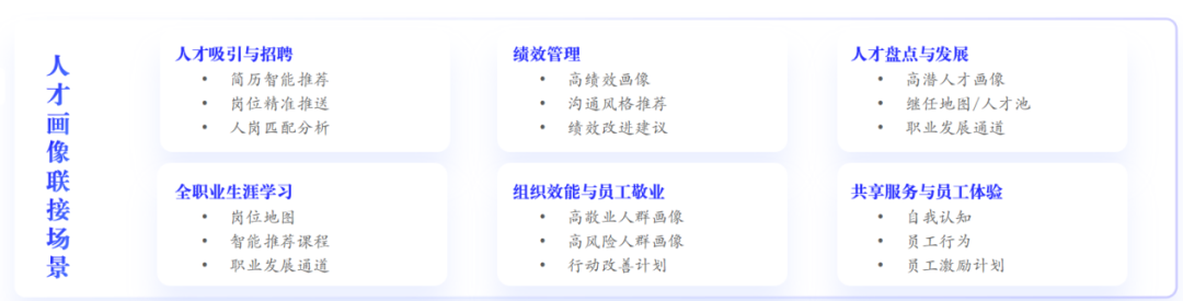 伴随数字化时代的开拓发展与人才管理技术与工具的不断更迭,使一体化的人才管理业务场景设计具备了较高的可行性。通过拉通“人才吸引与招聘、全面绩效管理、人才盘点与发展、全职业生涯学习、组织效能和员工敬业度、共享服务与员工体验”共六大场景,实现其与人才画像的深度连接与融合,从而拉通一体化人才管理场景化方案的各链路设计。
