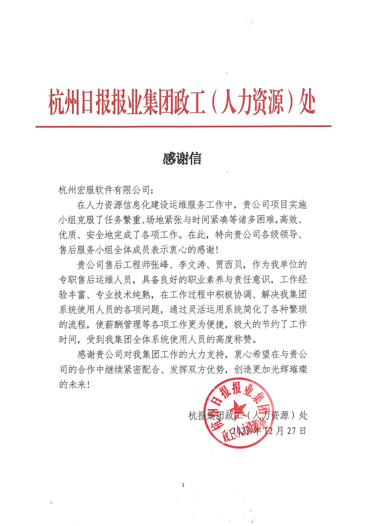 在岁末年初之际,杭州日报报业集团以一封热情洋溢的表扬信,点赞杭州宏服软件有限公司的售后工程师在系统运维过程中所展现的出色工作表现和敬业精神。信中对工程师们的高度专业素养和工作态度给予了极高的认可和褒奖。