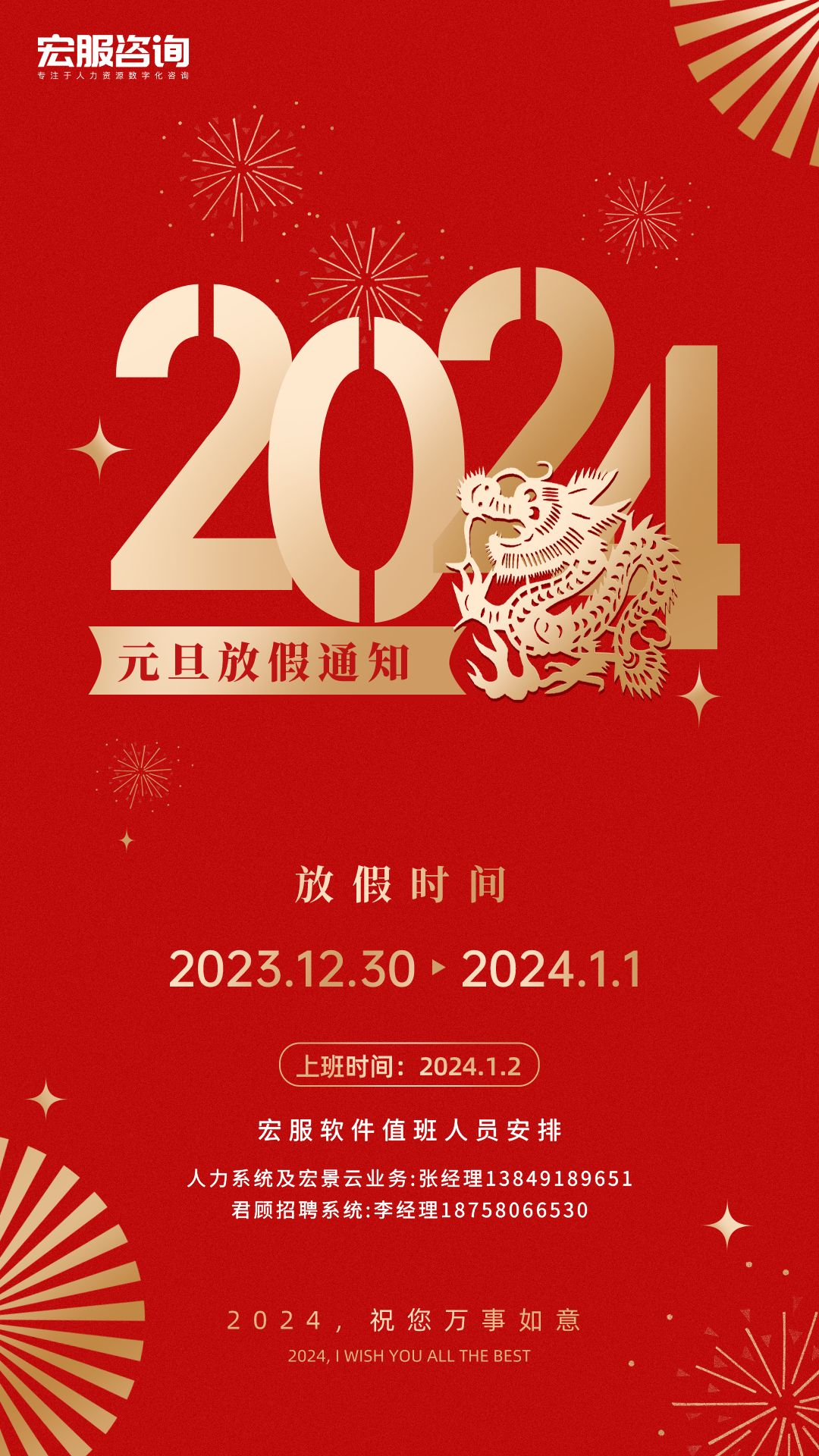 2024年宏服软件元旦放假通知与值班安排