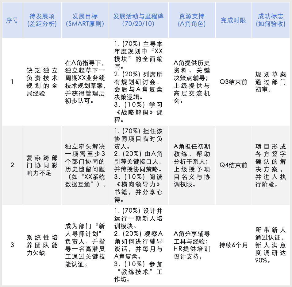 发展计划必须“对症下药”,为每一项高、中级差距设计沉浸式、挑战性的成长任务,而非简单的课程培训。