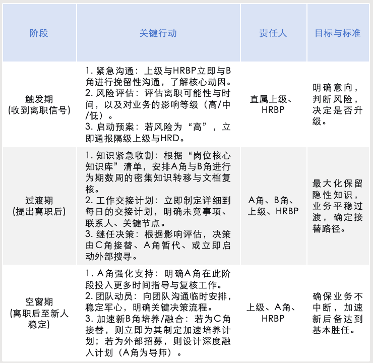 制定《关键岗位B角流失应急预案清单》,一旦触发,立即启动。