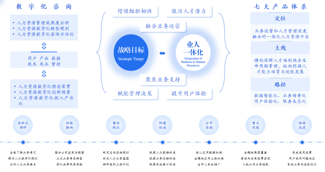七大产品体系:定位为业务运营和人才管理深度融合的一体化人力资源平台,专为HR领域打造低代码平台,帮助用户在人力资源新应用快速构建、流程管理和自动化等领域全面获得领先优势,加速人力资源数字化转型和运营创新。