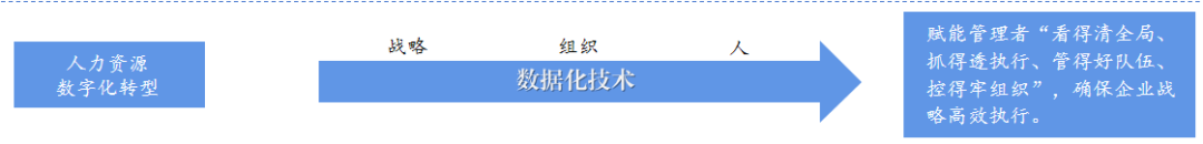 人力资源数字化转型的本质,是运用数据化技术,更紧密地连接“战略、组织和人”,升级迭代组织的战略执行力。通过数据驱动真正发挥数据价值,确保业务数字化的有效落地并反哺企业战略的持续达成,最终实现人力资源工作的具象化转变: