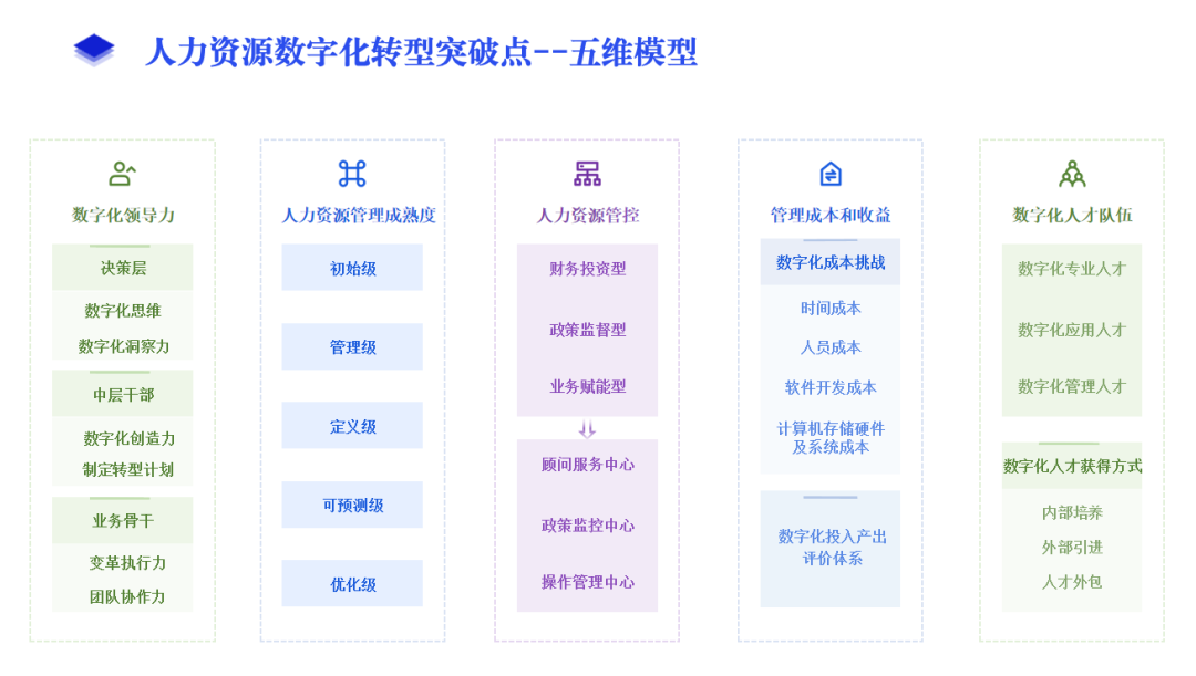在实现思维转变向转型驱动力寻求破局的数字化转型探索中,离不开企业领导者对数字化领导力、管理成熟度、人力资源管控,管理成本和收益、数字化人才队伍共五大维度的思索与考量。从长远来看,对上述五大维度的模型塑造成为国有企业实现数字化转型能力突破的关键动能之一。