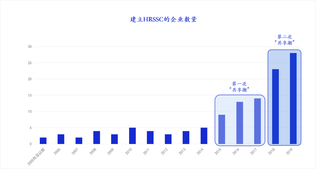 基于第三方咨询机构在2020年公布的《中国地区领先企业人力资源共享服务的调研报告》,实际上伴随HRSSC的建设势头上涨,2015 年开始,人力资源共享服务在国内形成第一次“共享潮”。而在 2018-2019 年,伴随着企业人力资源转型的浪潮以及人力资源技术的快速突破与发展,第二次“共享潮”悄然来袭,并有持续递增的趋势。