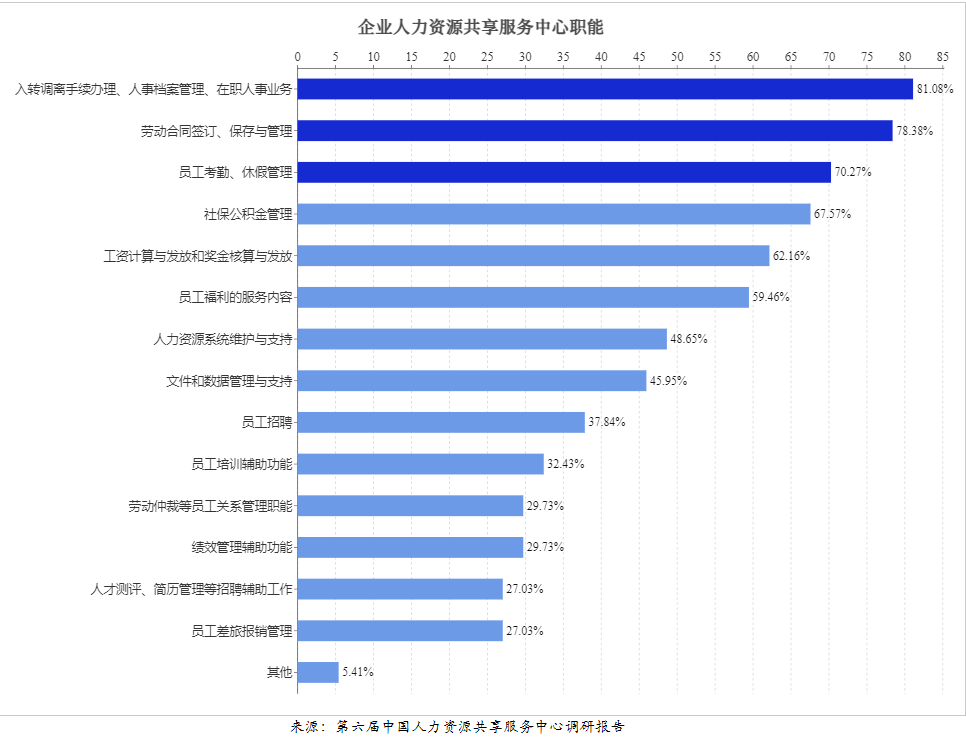 从建设内容角度出发,如图所示,人力资源共享服务中心职能排名第一位的是入转调离手续办理等,其次是劳动合同签订、保存与管理等......,总结来说,当前企业人力资源共享服务中心的主要建设内容仍聚焦于处理员工事务性工作。