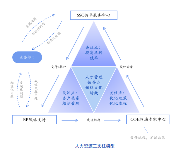 人力资源共享服务中心的建设离不开背后体制机制原理的探索,即人力资源三支柱模型——将其原有的管理模式进行变革,将人力资源部重新划分为三大支柱:即由COE(专家中心)、HRBP(人力资源业务伙伴)和SSC(共享服务中心)三类角色构成的人力资源体系。