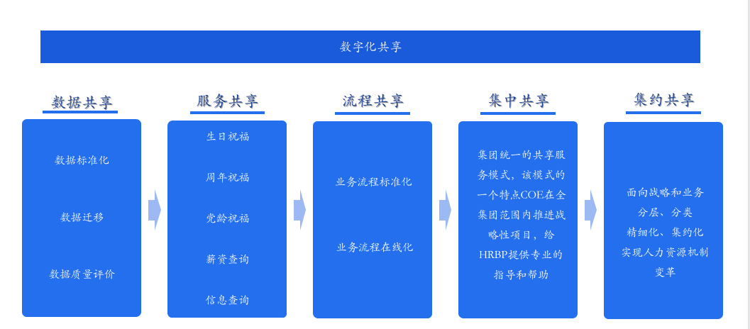 适合纳入HRSSC(共享服务中心)的工作往往具备交易量大、事务性、易标准化/集中化、能够清晰定义并文档化、要求高合规性、可自动化处理等特性。不具备这些特征的工作就不适合放到HRSSC中运作。从发展阶段的角度分析,我们可设计实现以下内容的数字化共享,具体内容如图: