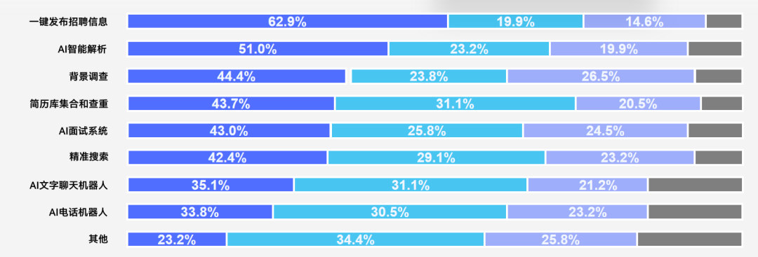 据相关调研机构报告显示:受访招聘企业最为频繁使用招聘数字化平台的一键发布招聘信息功能,占比62.9%。其次是简历解析功能,超过一半的企业表示经常使用。而未来随着AI及数字化技术的进一步成熟发展对招聘效率的提升效果将更加突出,企业对于AI面试等进阶功能需求也将逐渐增加。