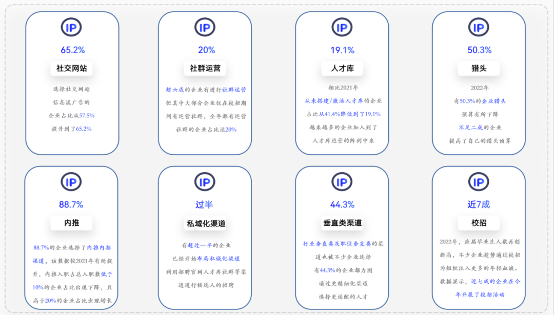 从招聘渠道分析出发:在近年来的人才引进工作中,企业谋篇布局于拓宽招聘渠道(如社交网站、社群运营、人才库、内推等私域化渠道与猎头等垂直类渠道),加速实现与潜在人才的信息触达。