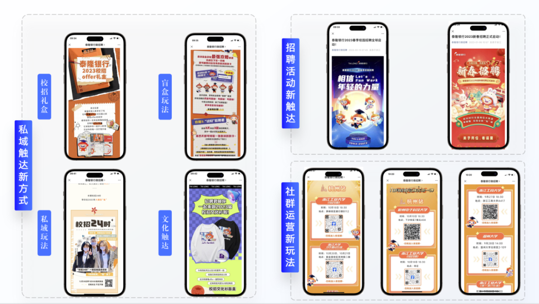 成长在互联网环境下的“Z世代”人群,拥有着多元的触媒方式。通过私域化社群运营,实现对“拉新、引流、管控、留存”等维度的全面触达。通过社交化新玩法,促进对潜在员工的多次触达,实现对应聘人员的前置影响与长期维护,潜化“心智定位”。