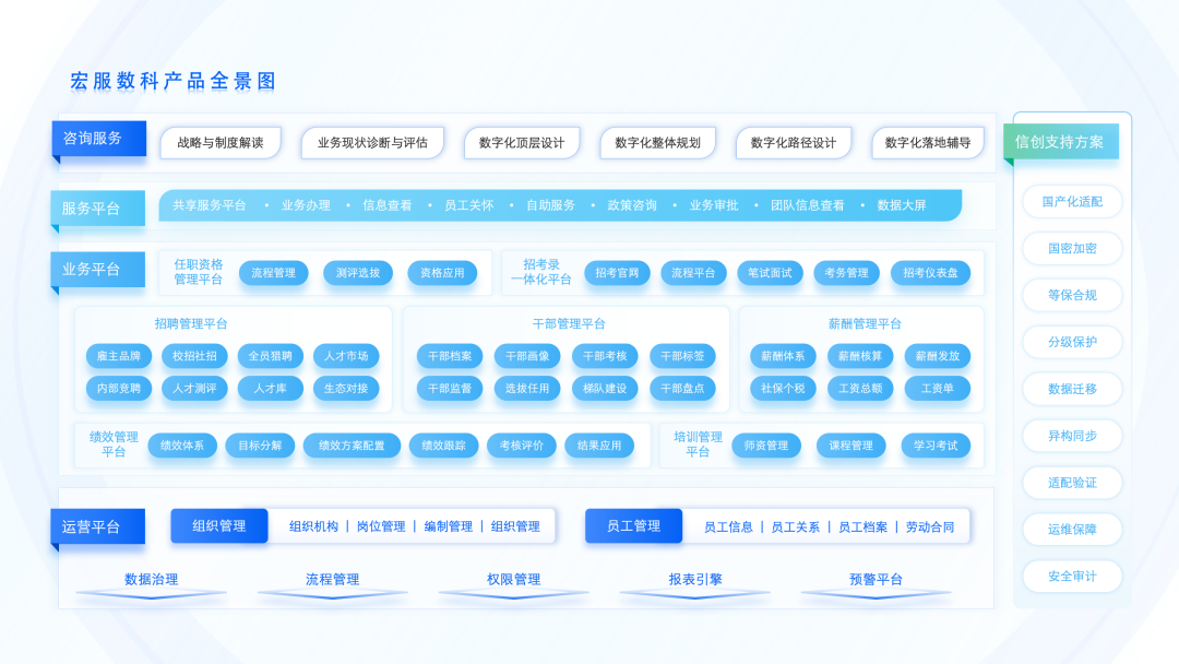 面对日益精进的国产化信息软件替代要求,宏服数科推出成熟信创支持方案,积极推动人力资源管理系统适配信创环境,助力数字人力系统平滑改造。积极推进将人力资源管理数智化系统建设纳入整体信创发展布局中来,提供从服务端到客户端的全栈式技术支持。