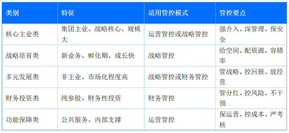 这是最核心的一步。必须根据子公司的战略地位、业务属性、发展阶段,对子公司进行分类,不同类别匹配不同管控模式。